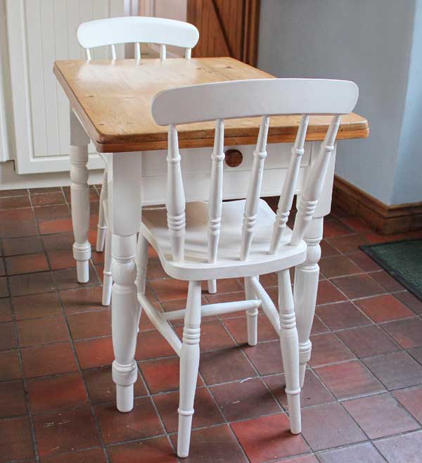 Once all the paint had dried it was simple to re-fit the top to the frame and we now have a lovely little breakfast table that matches our kitchen perfectly…and while we were at it we gave the chairs a makeover too!