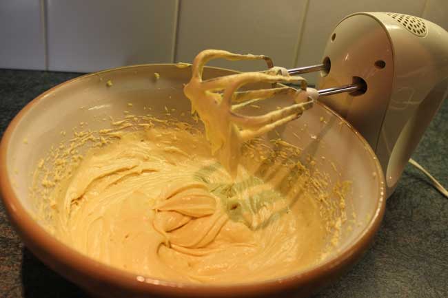 First of all put the butter and sugar into a large bowl and cream together. Add the eggs, flour and baking powder and continue mixing until you have a smooth batter.