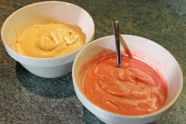 One of the bowls of mixture needs to be coloured pink so add a few drops of the red food colouring to one of them and stir gently until it is evenly coloured, we don’t want any streaks!