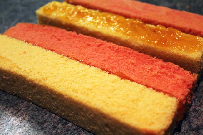 The ends now look a little untidy so use you large serrated knife to trim off a slice at each end for a perfect looking Battenberg cake.