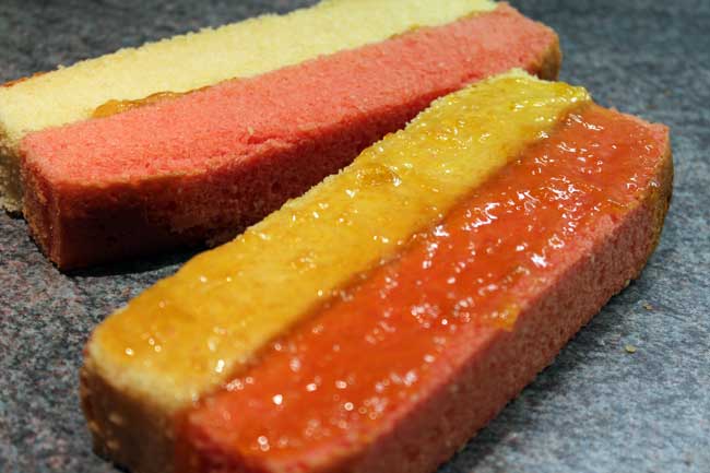 Now we have 2 pink cakes and 2 white cakes that just need to be stuck together with the jam. Spread some of the jam along one long edge of a white cake and join it to a pink cake, then do the same with the other 2 cakes.