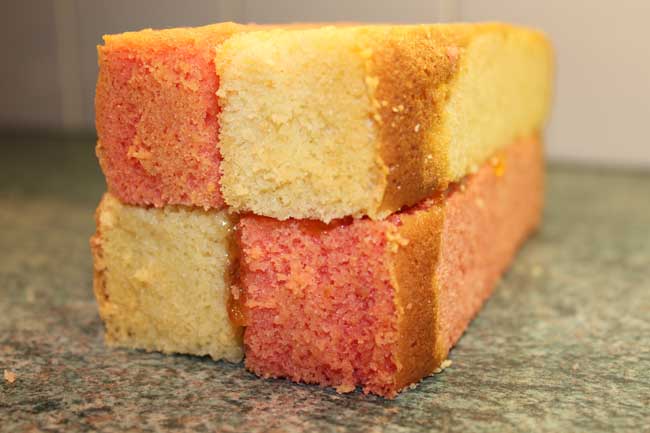 Now spread more jam onto the top of one of the joined sections ready to place the other on top, making sure that you have got the chequered effect by placing the pink side over the white side.
