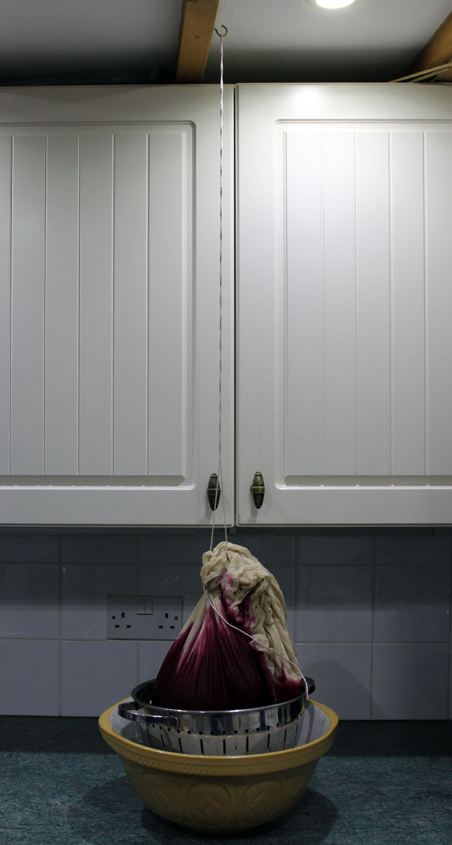 Now we need to separate the juice from the pulp, which is where your jelly bag or muslin comes in. Spoon the contents of the preserving pan into the jelly bag/muslin and hang from a hook with string to allow the juice to drip into the large bowl or if you prefer, you can use a Jam Straining Set like this, which is ideal for smaller amounts. As I had so much fruit I used about 1/2 meter of unbleached muslin that I tied at the top and suspended from a hook screwed into the beam of our kitchen ceiling! The colander is there just to support the muslin as the fruit was spooned in, it was removed when it was secured to the hook in the beam!
