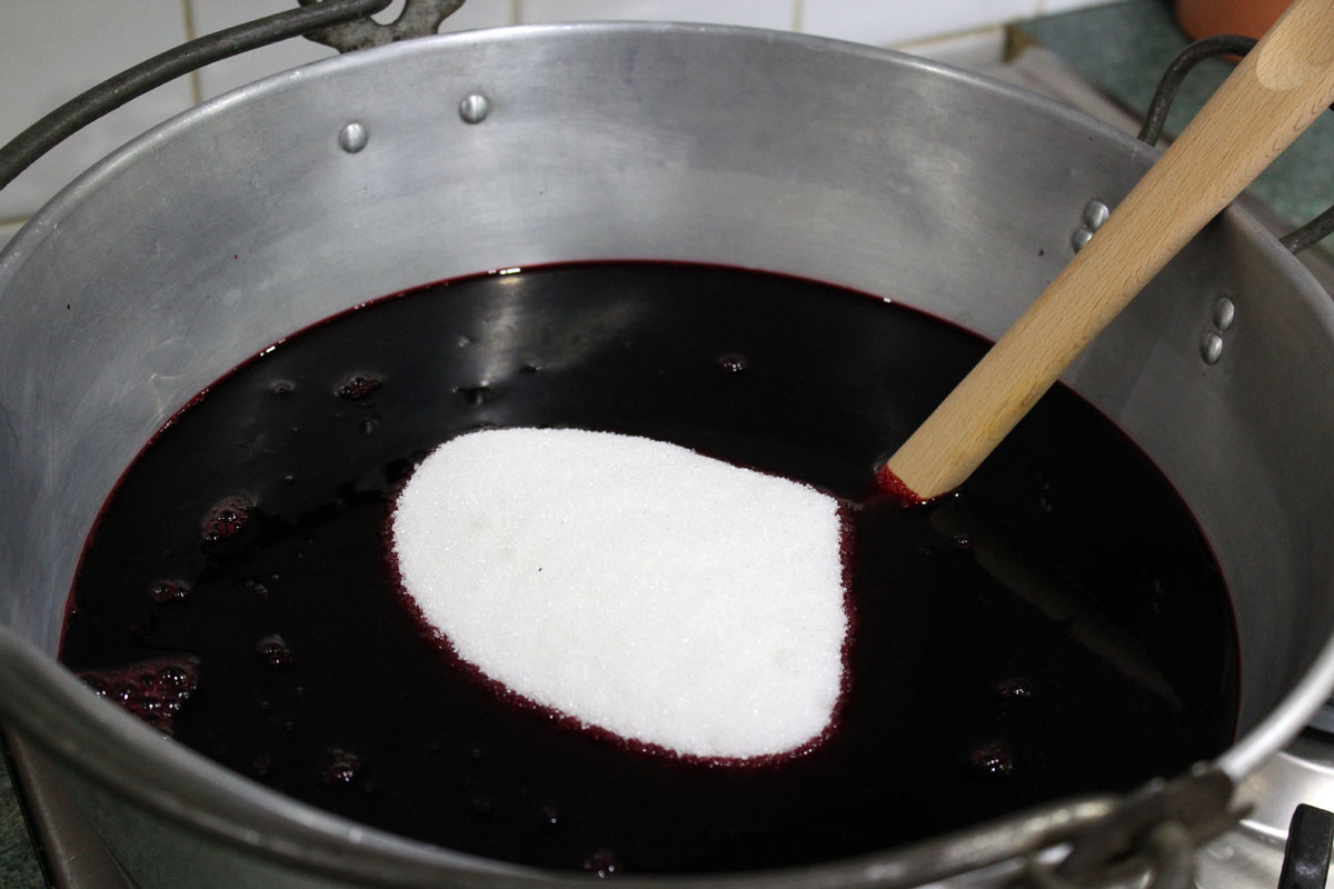 Next day, measure the juice and pour it into the preserving pan. The general rule of thumb is 1 lb sugar for every pint of juice so weigh out enough sugar and pour that into the preserving pan with the juice.