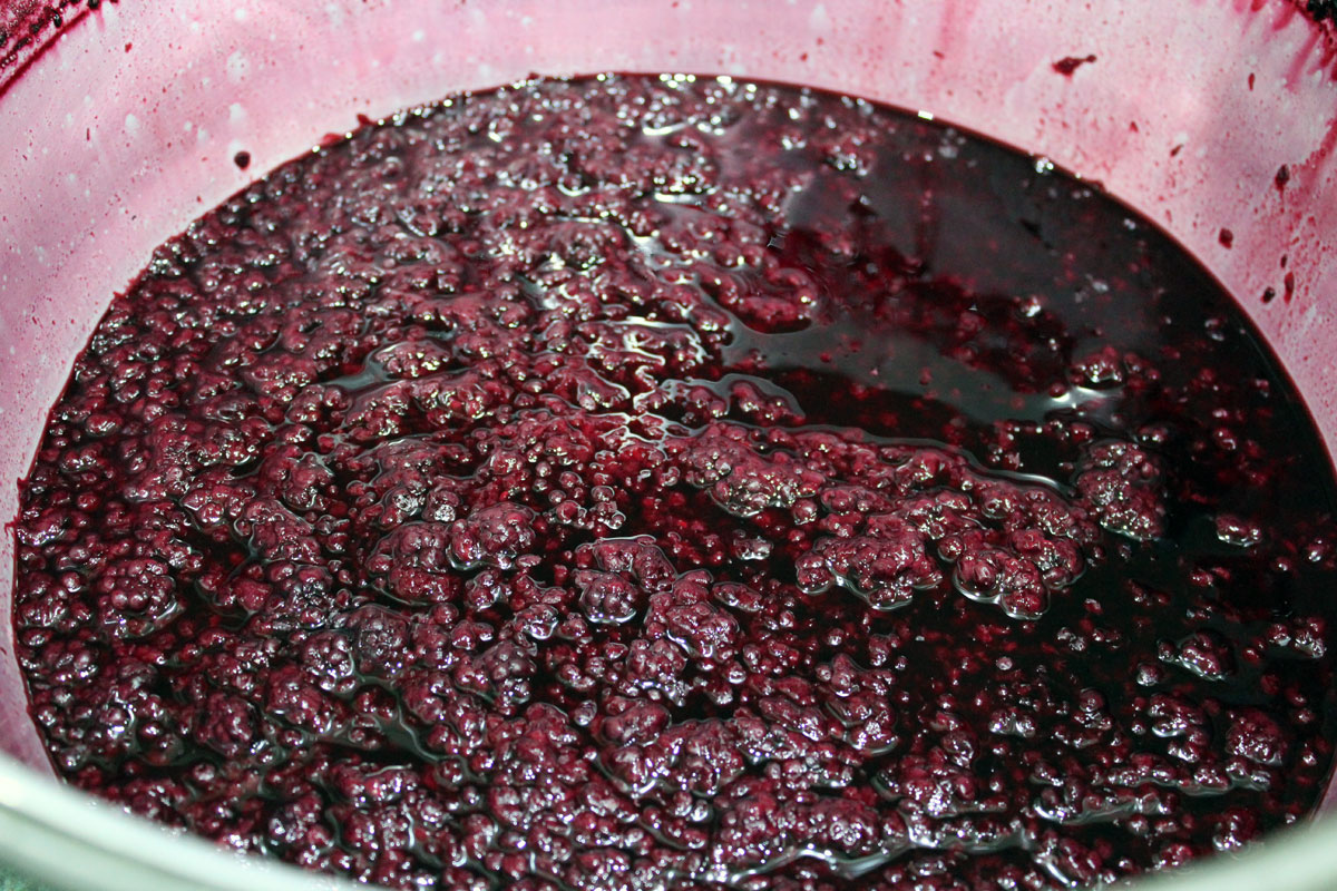 Heat gently until the juices start to run and then simmer for about an hour the extract as much juice as possible – use a potato masher if the fruit is fresh but probably no need if frozen as the berries collapse quite readily when defrosted.
