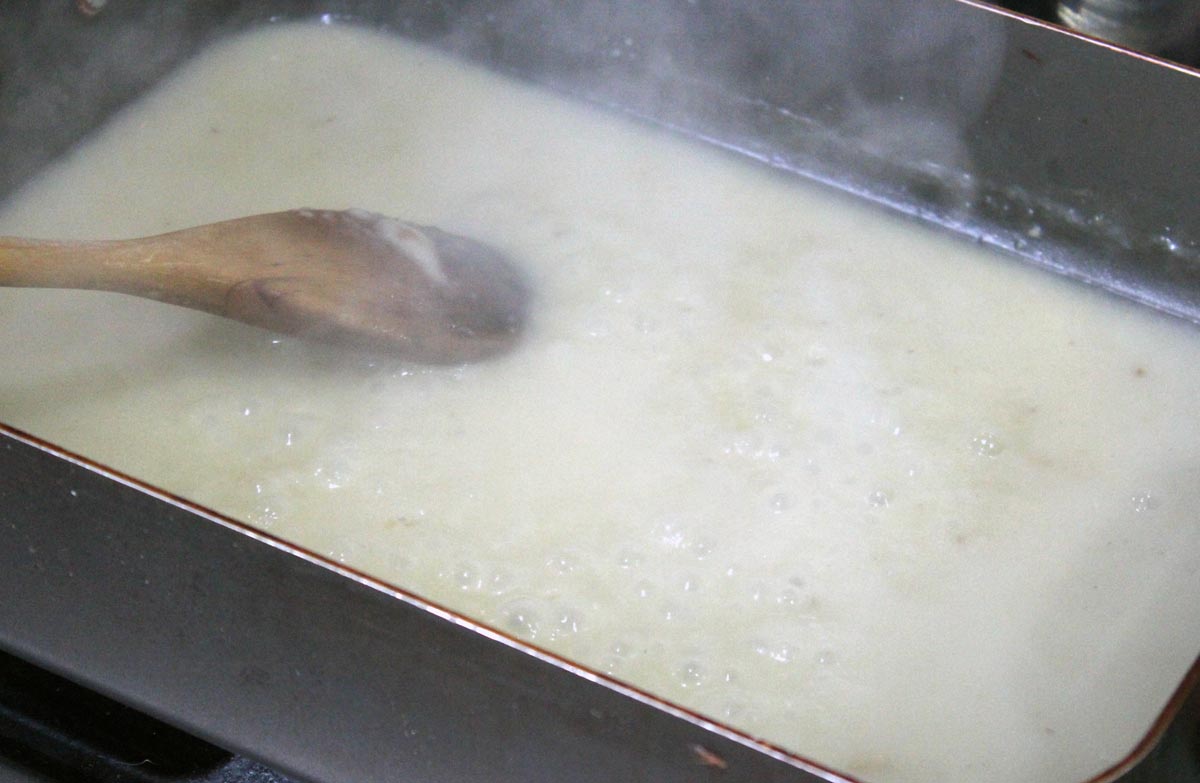 Most of the fat is then drained from the pan, leaving behind the meat juices and about 2 tablespoons of fat before the roasting pan is then put on the hob over a medium heat. I was aiming to make about 1 pint of gravy so I added 1½ rounded tablespoons of plain flour, which was stirred into the fat and juices until a paste was formed and continued to stir for about a minute.