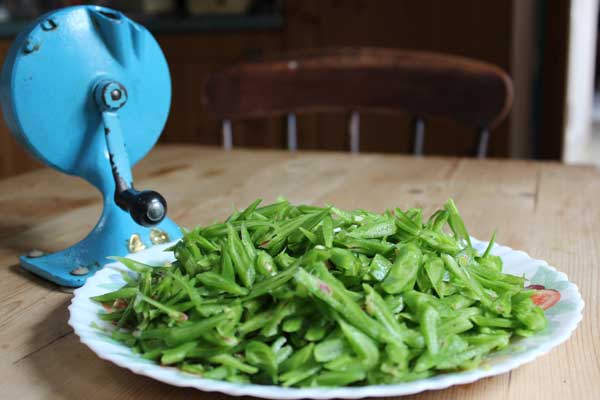 Today, we were able to get our first picking and have a taste of these prolific vegetables! Having topped and tailed them, we took the ‘strings’ from the sides using a potato peeler (makes for a very quick and neat job!) and then used our ancient Spong bean slicer to slice them ready for cooking.