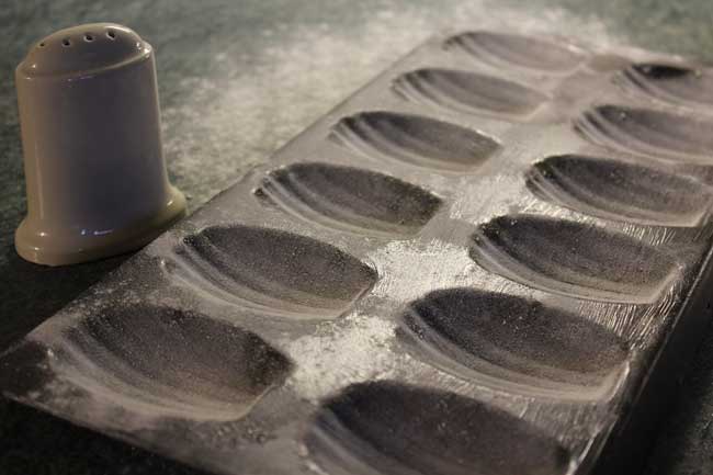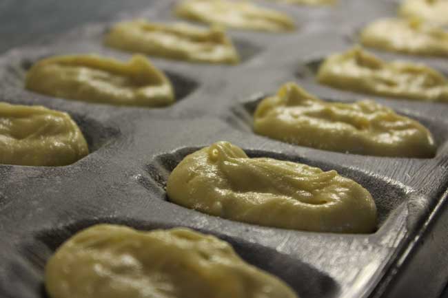 When everything is well mixed, place a dessertspoon of the mixture into each of the shells on the madeleine tin (they should be about 3/4 full).
