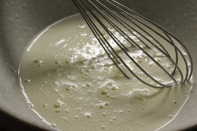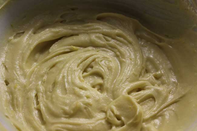 Slowly whisk in the melted and cooled butter, flour, baking powder and lemon zest.