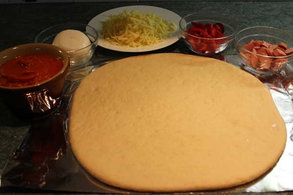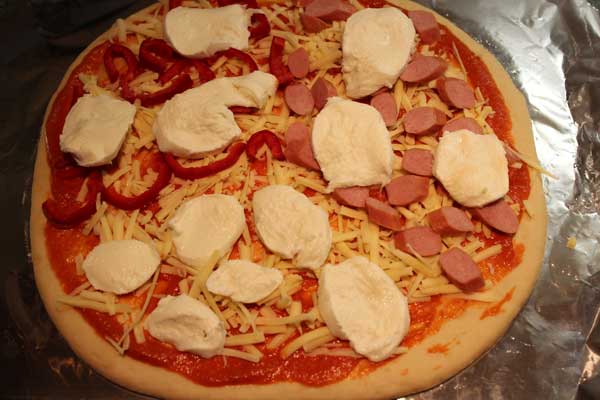 …and anything else you fancy! I have divided this pizza into 3 sections with one third just plain cheese and tomato, another third has some lovely sliced red peppers and the final third I topped with some sliced frankfurter sausages.